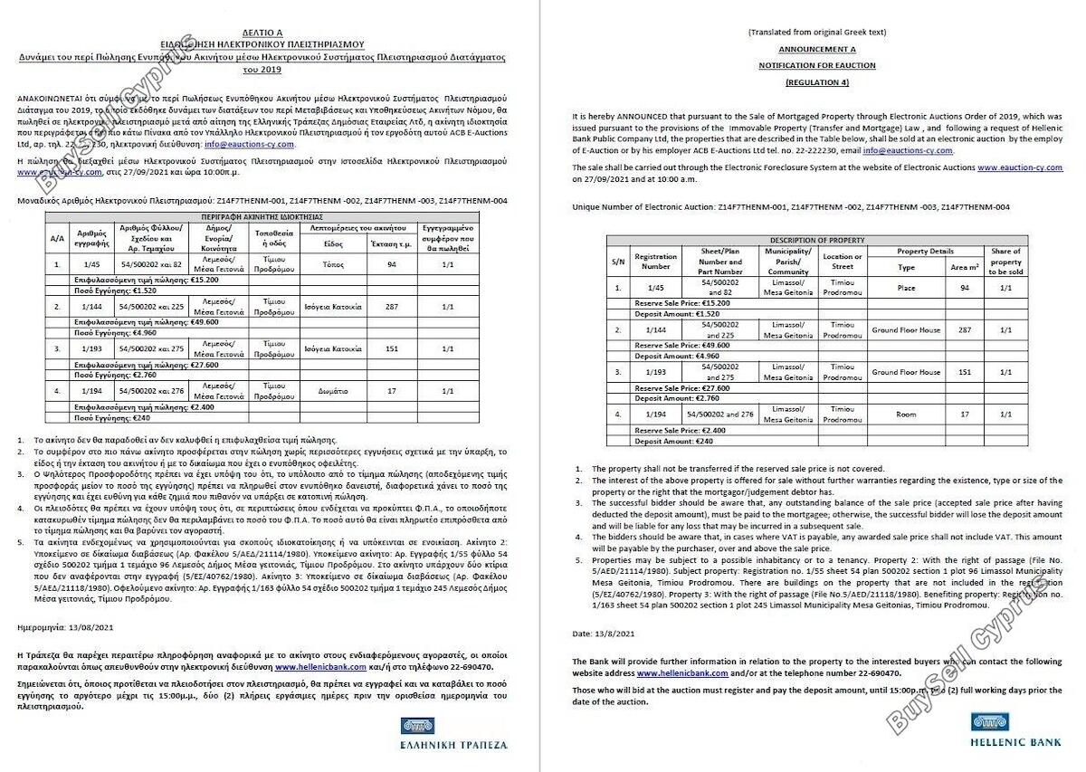 Aukcja zostanie przeprowadzona za pośrednictwem Elektronicznego Systemu Wykluczenia na stronie internetowej Aukcji Elektronicznych www.eauction-cy.com (https://www.eauction-cy.com/Auction/Details/5227) w dniu 27.09.2021 r. o godz. 10:00 Unikalny numer aukcji elektronicznej: Z14F7THENM-002 . Nieruchomość objęta jest 100% udziałem. Aby uzyskać więcej informacji prosimy o kontakt (22-690470). Należy pamiętać, że podana powyżej cena jest ceną zastrzeżoną aukcji. Osoby, które będą licytować na aukcji, muszą się zarejestrować i wpłacić kaucję do godziny 15:00. dwa (2) pełne dni robocze przed datą aukcji.