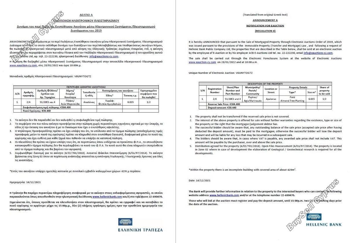 Aukcja zostanie przeprowadzona za pośrednictwem Elektronicznego Systemu Wykluczenia na stronie internetowej Aukcji Elektronicznych www.eauction-cy.com w dniu 28.01.2022 r. o godz. 10:00 Unikalny Numer Aukcji Elektronicznej: V6UNYTOGTZ. Nieruchomość odnosi się do 50% udziału. Aby uzyskać więcej informacji prosimy o kontakt (22-690470). Należy pamiętać, że podana powyżej cena jest ceną zastrzeżoną aukcji. Osoby, które będą licytować na aukcji, muszą się zarejestrować i wpłacić kaucję do godziny 15:00. dwa (2) pełne dni robocze przed datą aukcji.