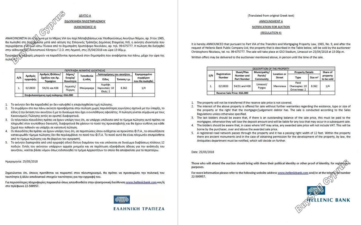 Aukcja odbędzie się 25.04.2018 o godzinie 13:00 na stadionie GSO w Limassol. Nieruchomość odnosi się do 25% udziału. Aby uzyskać więcej informacji prosimy o kontakt (22-690329). Należy pamiętać, że podana powyżej cena jest ceną zastrzeżoną aukcji.