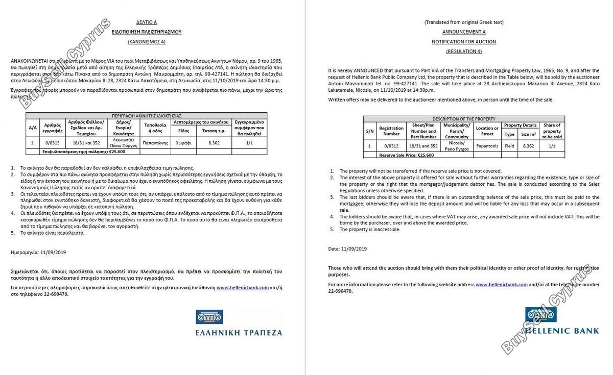 Aukcja odbędzie się 11.10.2019 o godzinie 14:30 przy 28 Archiepiskopou Makariou III Avenue, 2324, Kato Lakatameia, Nikozja. Nieruchomość objęta jest 100% udziałem. Aby uzyskać więcej informacji prosimy o kontakt (22-690470). Należy pamiętać, że podana powyżej cena jest ceną zastrzeżoną aukcji.