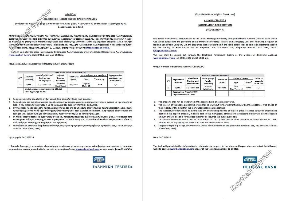 Aukcja zostanie przeprowadzona za pośrednictwem Systemu Elektronicznego Wykluczenia na stronie internetowej Aukcji Elektronicznych www.eauction-cy.com w dniu 08.01.2021 r. o godz. 10:00 Unikalny Numer Aukcji Elektronicznej: 3QSR2FZZDO - (https://www. eauction-cy.com/Auction/Details/2129) . Nieruchomość objęta jest 100% udziałem. Aby uzyskać więcej informacji prosimy o kontakt (22-690470). Należy pamiętać, że podana powyżej cena jest ceną zastrzeżoną aukcji. Osoby, które będą licytować na aukcji, muszą się zarejestrować i wpłacić kaucję do godziny 15:00. dwa (2) pełne dni robocze przed datą aukcji.