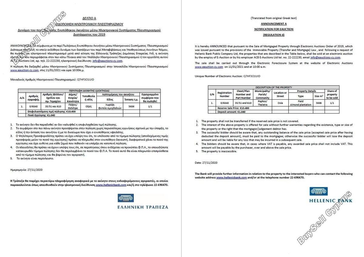 Aukcja zostanie przeprowadzona za pośrednictwem Elektronicznego Systemu Wykluczenia na stronie internetowej Aukcji Elektronicznych www.eauction-cy.com (https://www.eauction-cy.com/Auction/Details/2043) w dniu 11.01.2021 r. o godz. 10:00 Unikalny numer aukcji elektronicznej: Q7HF3O1UID. Nieruchomość objęta jest 100% udziałem. Aby uzyskać więcej informacji prosimy o kontakt (22-690470). Należy pamiętać, że podana powyżej cena jest ceną zastrzeżoną aukcji. Osoby, które będą licytować na aukcji, muszą się zarejestrować i wpłacić kaucję do godziny 15:00. dwa (2) pełne dni robocze przed datą aukcji.