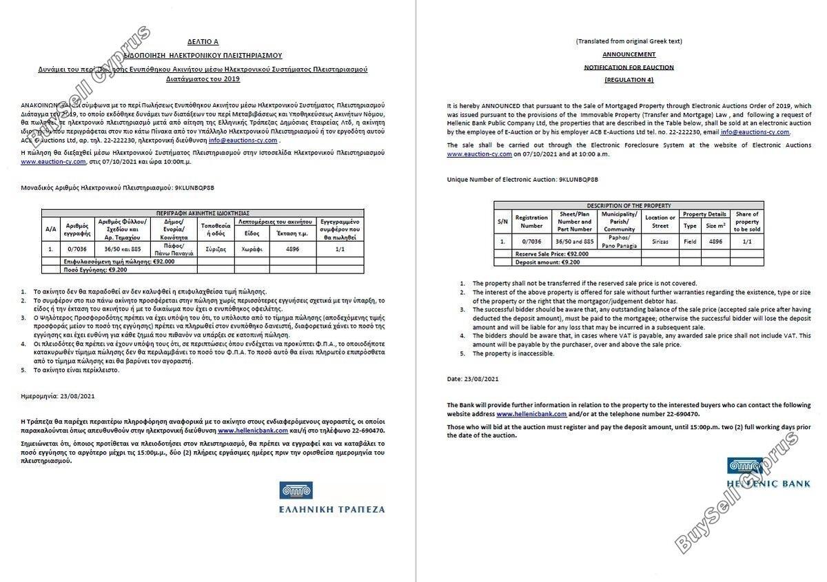 Aukcja zostanie przeprowadzona za pośrednictwem Elektronicznego Systemu Wykluczenia na stronie internetowej Aukcji Elektronicznych www.eauction-cy.com (https://www.eauction-cy.com/Auction/Details/5305) w dniu 07.10.2021 o godz. 10:00 Unikalna liczba aukcji elektronicznych: 9KLUNBQP8B. Nieruchomość objęta jest 100% udziałem. Aby uzyskać więcej informacji prosimy o kontakt (22-690470). Należy pamiętać, że podana powyżej cena jest ceną zastrzeżoną aukcji. Osoby, które będą licytować na aukcji, muszą się zarejestrować i wpłacić kaucję do godziny 15:00. dwa (2) pełne dni robocze przed datą aukcji.