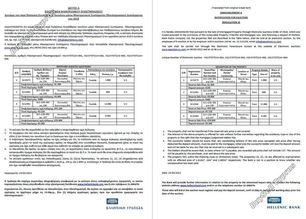 Aukcja zostanie przeprowadzona za pośrednictwem Elektronicznego Systemu Wykluczenia na stronie internetowej Aukcji Elektronicznych www.eauction-cy.com w dniu 09.05.2022 o godz. 10:00 Unikalny Numer Aukcji Elektronicznej: XQV37DTZ1W-001. Nieruchomość objęta jest 100% udziałem. Aby uzyskać więcej informacji prosimy o kontakt (22-690470). Należy pamiętać, że podana powyżej cena jest ceną zastrzeżoną aukcji. Osoby, które będą licytować na aukcji, muszą się zarejestrować i wpłacić kaucję do godziny 15:00. dwa (2) pełne dni robocze przed datą aukcji.