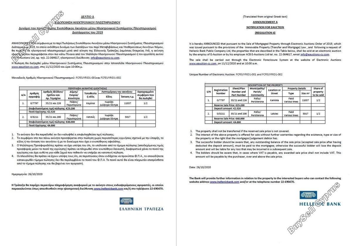 Aukcja zostanie przeprowadzona za pośrednictwem Elektronicznego Systemu Wykluczenia na stronie internetowej Aukcji Elektronicznych www.eauction-cy.com (https://www.eauction-cy.com/Auction/Details/1482) w dniu 11.12.2020 r. o godz. 10:00 Unikalny numer aukcji elektronicznej: FCFEUYRID1-001. Nieruchomość odnosi się do 50% udziału. Aby uzyskać więcej informacji prosimy o kontakt (22-690470). Należy pamiętać, że podana powyżej cena jest ceną zastrzeżoną aukcji. Osoby, które będą licytować na aukcji, muszą się zarejestrować i wpłacić kaucję do godziny 15:00. dwa (2) pełne dni robocze przed datą aukcji.