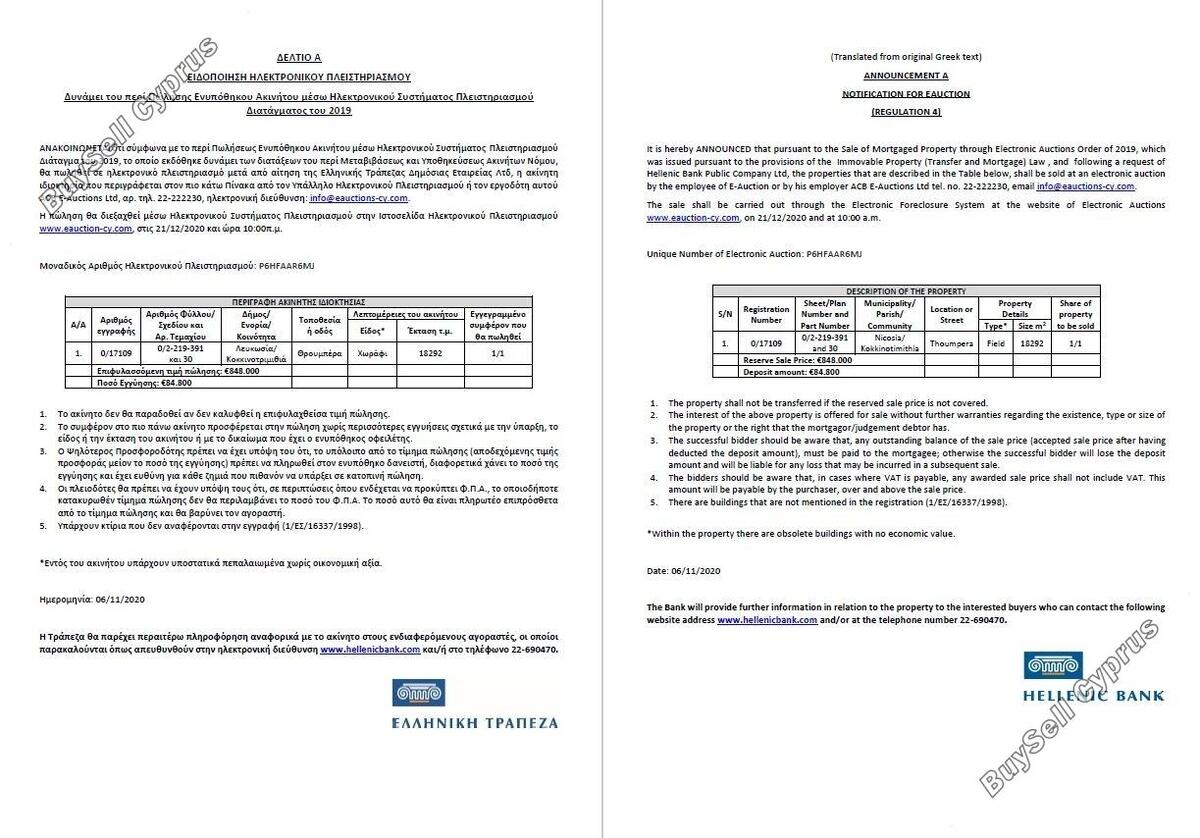 Aukcja zostanie przeprowadzona za pośrednictwem Elektronicznego Systemu Wykluczenia na stronie internetowej Aukcji Elektronicznych www.eauction-cy.com (https://www.eauction-cy.com/Auction/Details/1880) w dniu 21.12.2020 r. o godz. 10:00 Unikalny numer aukcji elektronicznej: P6HFAAR6MJ. Nieruchomość objęta jest 100% udziałem. Aby uzyskać więcej informacji prosimy o kontakt (22-690470). Należy pamiętać, że podana powyżej cena jest ceną zastrzeżoną aukcji. Osoby, które będą licytować na aukcji, muszą się zarejestrować i wpłacić kaucję do godziny 15:00. dwa (2) pełne dni robocze przed datą aukcji.