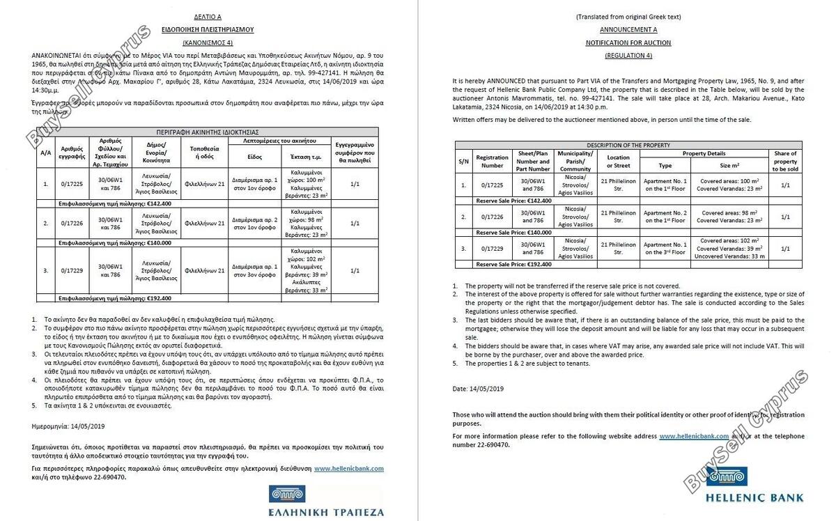 Aukcja odbędzie się 14.06.2019 o godzinie 14:30 w 28 Archiepiskopou Makariou III Avenue, 2324, Kato Lakatameia, Nikozja. Nieruchomość objęta jest 100% udziałem. Aby uzyskać więcej informacji prosimy o kontakt (22-690 470). Należy pamiętać, że podana powyżej cena jest minimalną dopuszczalną ceną aukcji.