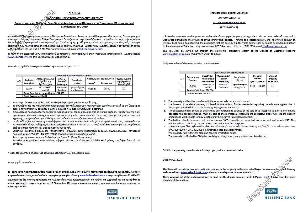Aukcja zostanie przeprowadzona za pośrednictwem Elektronicznego Systemu Wykluczenia na stronie internetowej Aukcji Elektronicznych www.eauction-cy.com w dniu 20.04.2022 r. o godz. 10:00 Unikalny Numer Aukcji Elektronicznej: 1CQ3UU1O7H. Nieruchomość objęta jest 100% udziałem. Aby uzyskać więcej informacji prosimy o kontakt (22-690470). Należy pamiętać, że podana powyżej cena jest ceną zastrzeżoną aukcji. Osoby, które będą licytować na aukcji, muszą się zarejestrować i wpłacić kaucję do godziny 15:00. dwa (2) pełne dni robocze przed datą aukcji.