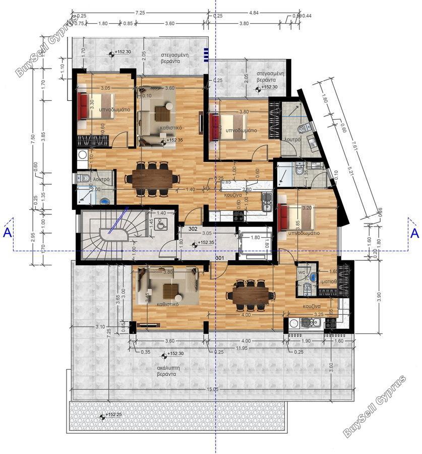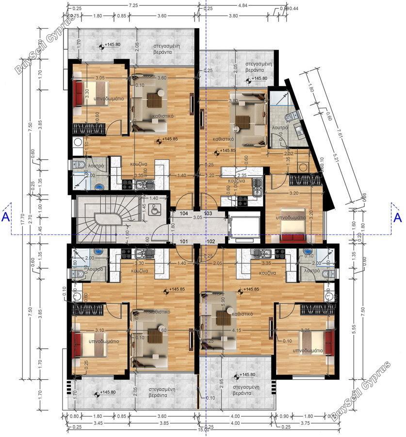 Na parterze znajdują się parkingi oraz szatnie komunalne i prysznice dla basenu komunalnego. Na pierwszym i drugim piętrze znajdują się cztery apartamenty, wszystkie z 1 sypialnią. Na trzecim piętrze znajdują się dwa apartamenty, jeden apartament z 1 sypialnią i jeden apartament z 2 sypialniami.