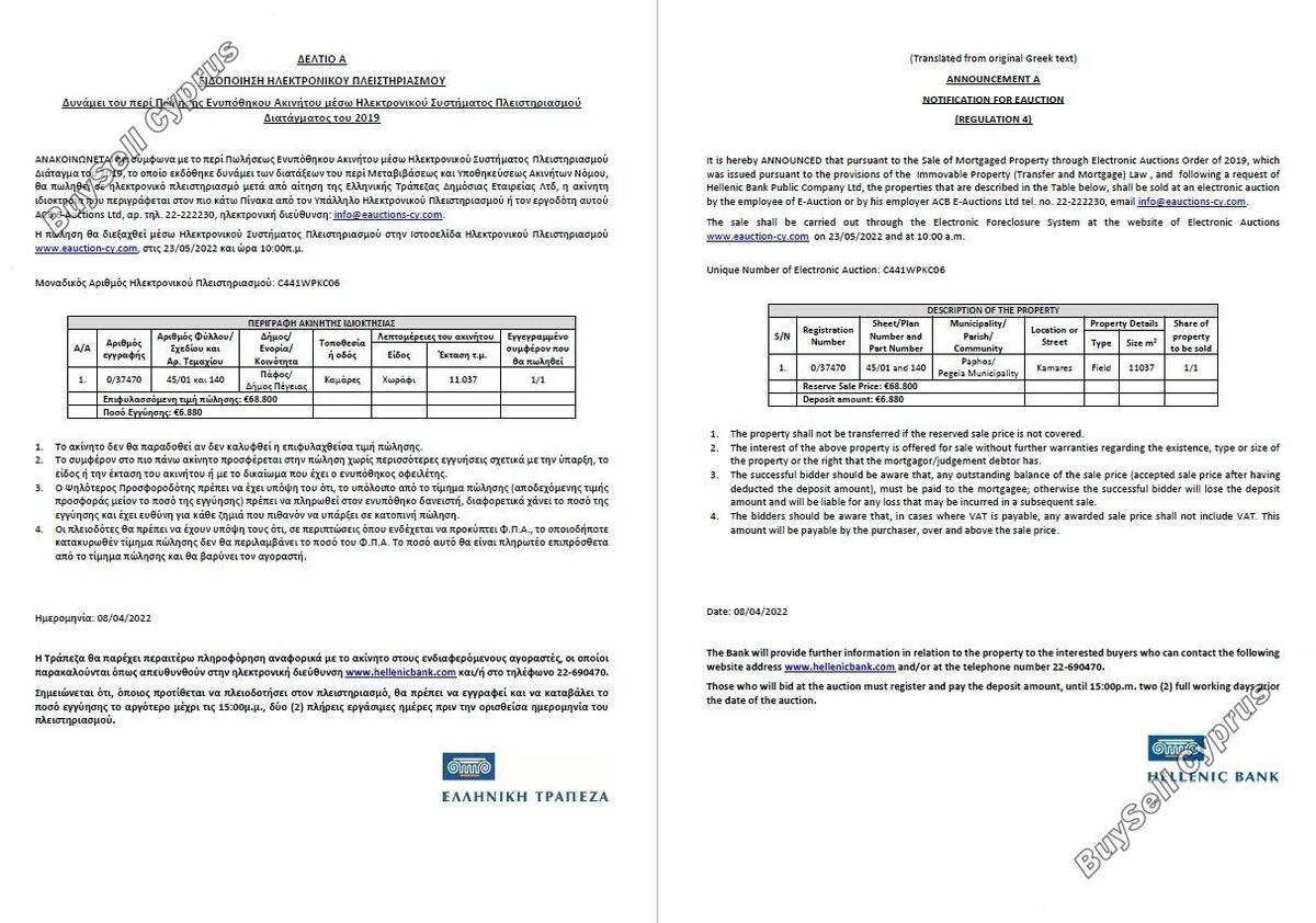 Aukcja zostanie przeprowadzona za pośrednictwem Systemu Elektronicznego Wykluczenia na stronie internetowej Aukcji Elektronicznych www.eauction-cy.com w dniu 23.05.2022 r. o godz. 10:00 Unikalny Numer Aukcji Elektronicznej: C441WPKC06. Nieruchomość objęta jest 100% udziałem. Aby uzyskać więcej informacji prosimy o kontakt (22-690470). Należy pamiętać, że podana powyżej cena jest ceną zastrzeżoną aukcji. Osoby, które będą licytować na aukcji, muszą się zarejestrować i wpłacić kaucję do godziny 15:00. dwa (2) pełne dni robocze przed datą aukcji.