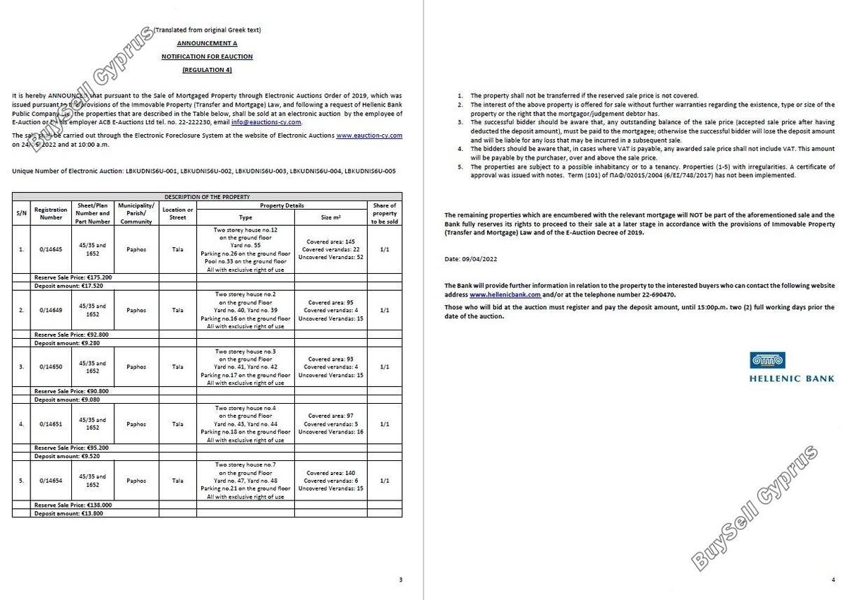 Aukcja zostanie przeprowadzona za pośrednictwem Elektronicznego Systemu Wykluczenia na stronie internetowej Aukcji Elektronicznych www.eauction-cy.com w dniu 24.05.2022 r. o godz. 10:00 Unikalny Numer Aukcji Elektronicznej: LBKUDNIS6U-001. Nieruchomość objęta jest 100% udziałem. Aby uzyskać więcej informacji prosimy o kontakt (22-690470). Należy pamiętać, że podana powyżej cena jest ceną zastrzeżoną aukcji. Osoby, które będą licytować na aukcji, muszą się zarejestrować i wpłacić kaucję do godziny 15:00. dwa (2) pełne dni robocze przed datą aukcji.